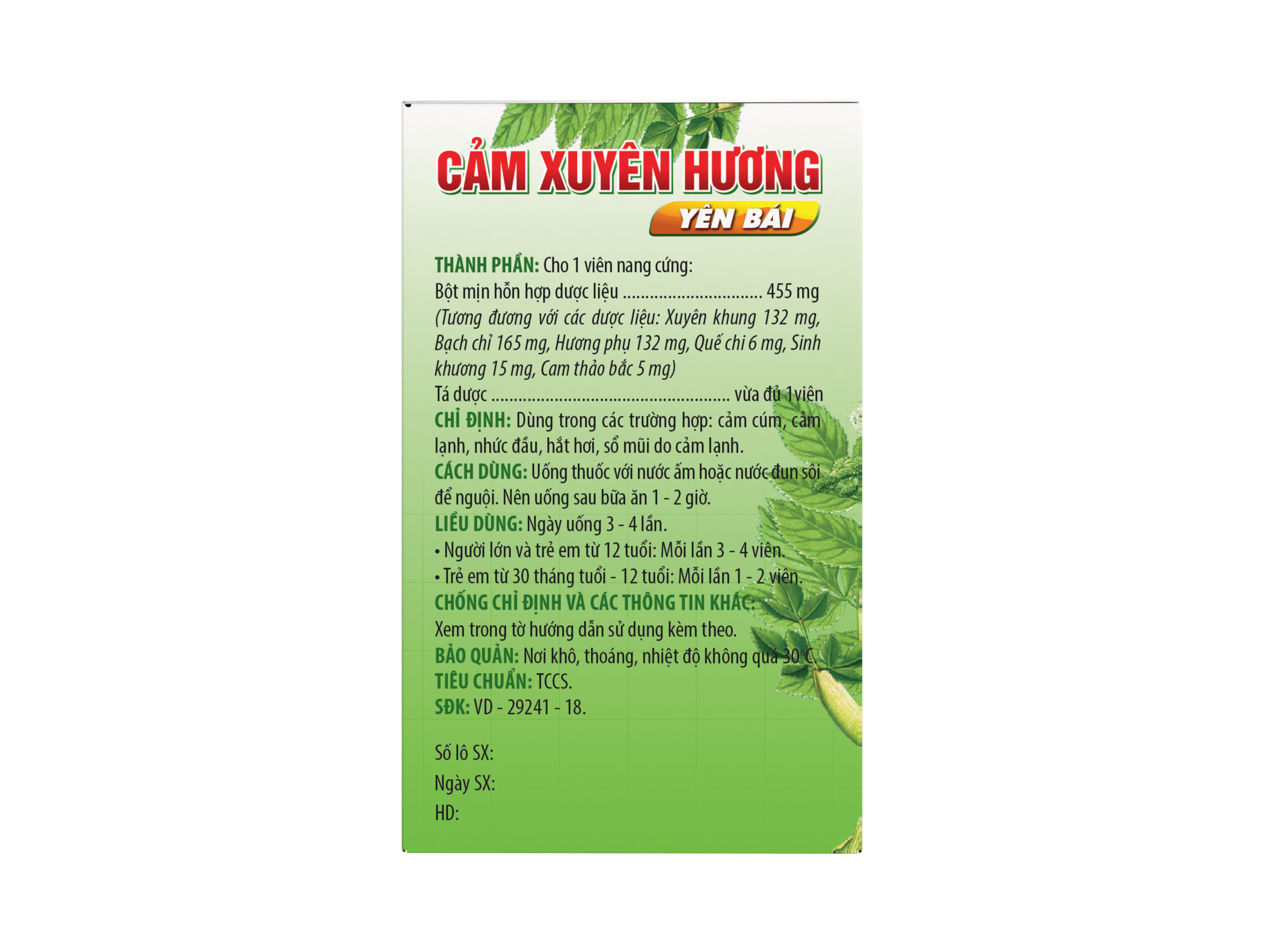 Xuyên khung, Bạch chỉ, Hương phụ, Cam thảo bắc, Quế chi, Sinh khương. Phụ liệu: PVP, Bột Talc